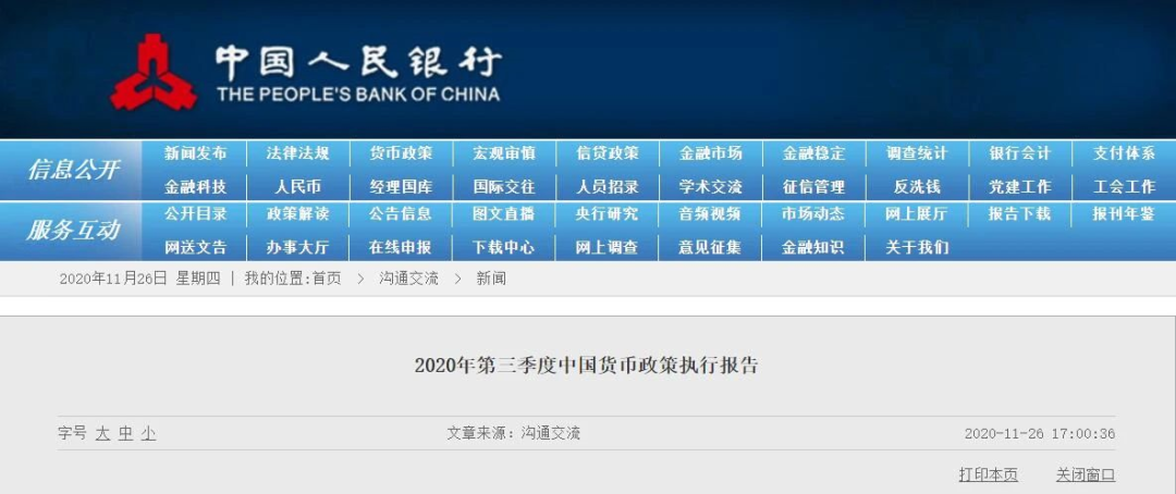 11月26日傍晚,央行发布2020年第三季度重磅货币政策报告。